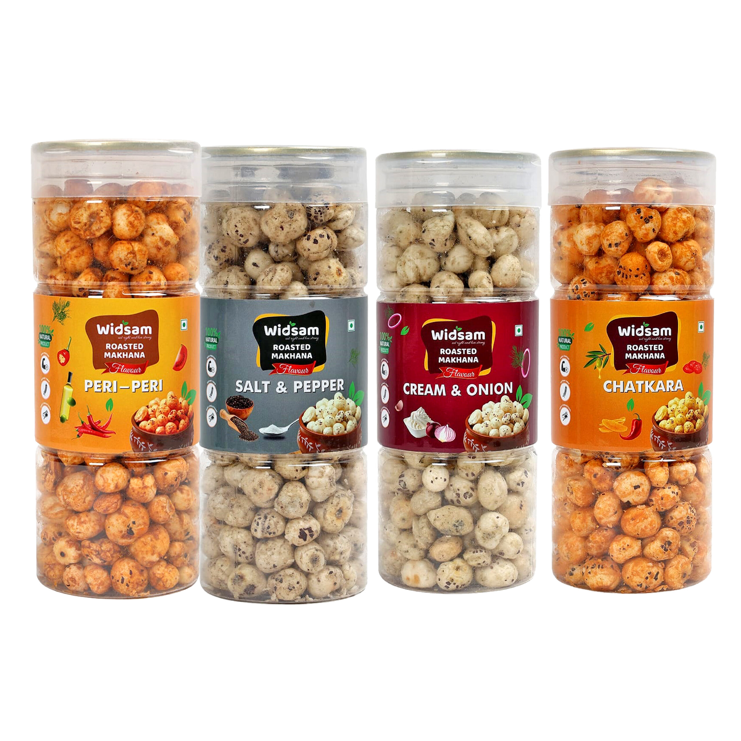 Widsam Roasted Makhana, Peri Peri, Salt & Pepper, Cream & Onion & Chatkara Tangy Cheese Flavour I 90g Each I Healthy Snack | Guilt-Free & Crunchy Munchies | Pack of 4